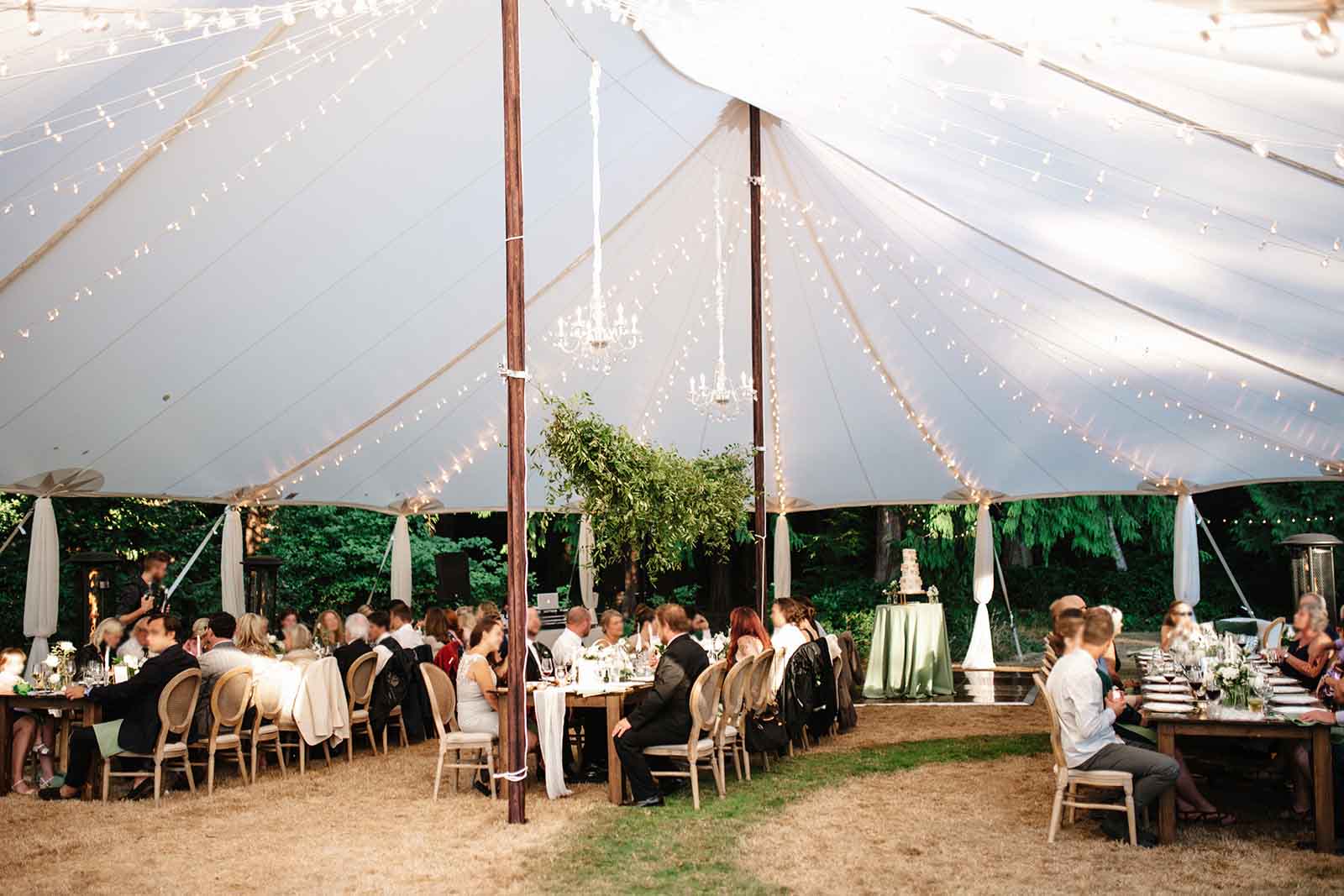 The tent for this wedding measured an expansive 43 by 63 feet, and in addition to banquet tables for a sit-down meal, it also accommodated a 19 X 19-foot dance floor, a beautifully appointed lounge area and a cocktail area with high-top tables also supplied by our company. This was only the second installation of a sail cloth tent by our team. Our first experience took place on a windswept and rainy day on the University of British Columbia campus earlier that spring. By comparison, measuring and laying out the location of this tent, its perimeter legs and center poles and then gently raising the fabric peaks this time was almost easy.